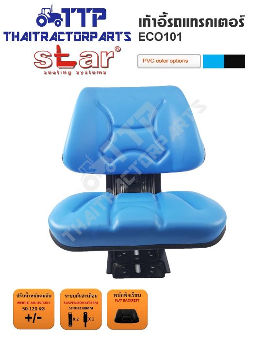 ตราสินค้า : STAR วัสดุหุ้มเบาะ : PVC สี : ดำ, ฟ้า พนักพิง : แบบเรียบ ระบบรับแรงสั่นสะเทือน : สปริง 2 ตัว และ โช๊คอัพ 1 ตัว ระยะรับแรงสั่นสะเทือน (มม.): 80 มิลลิเมตร ปรับตั้งน้ำหนักผู้ขับขี่ได้ : 50-120 กิโลกรัม